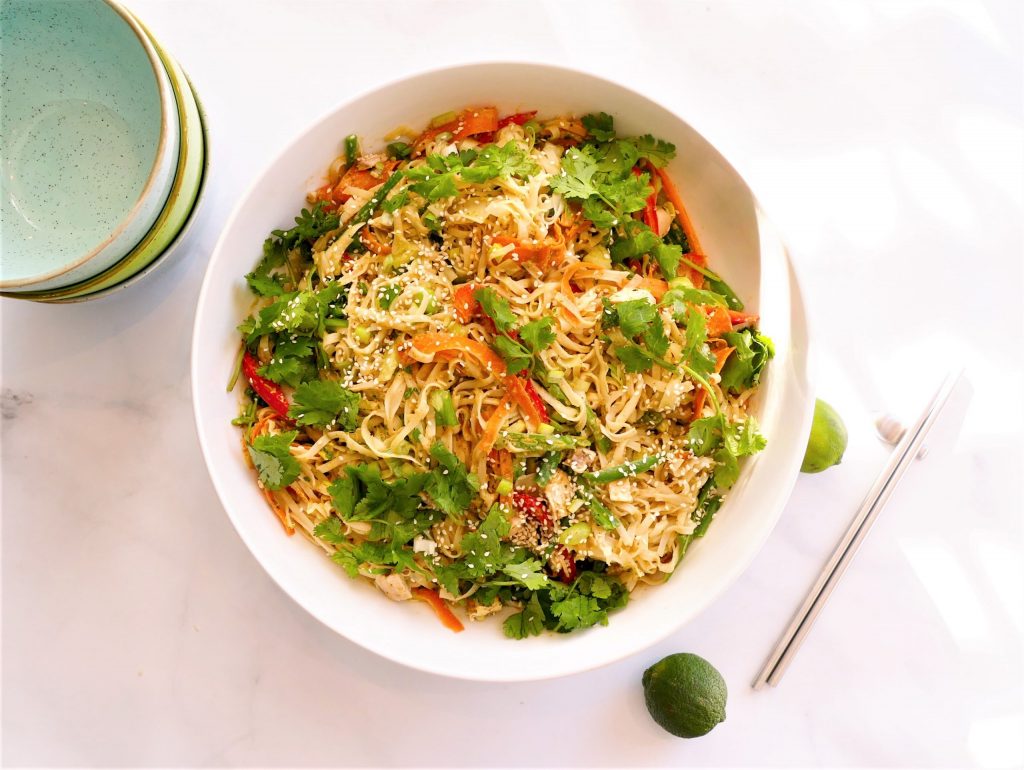 Salade de nouilles asiatiques aux sésames grillés avec poulet ou végétalienne
