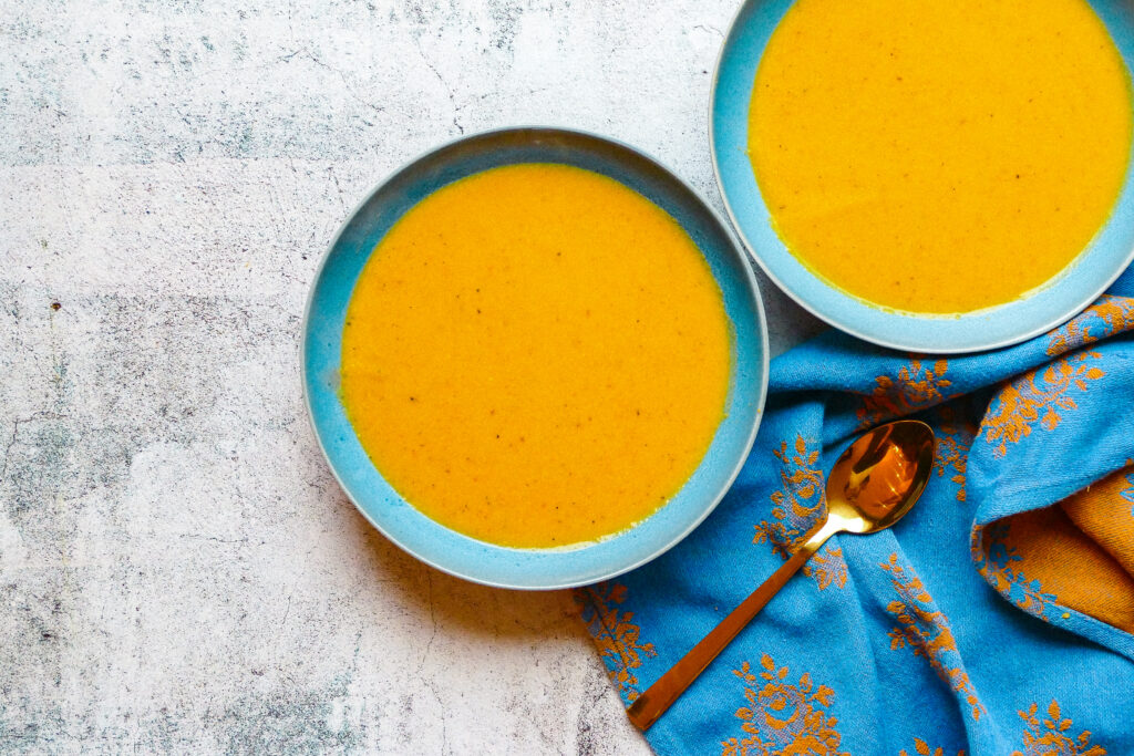 Potage de courge, carotte, PVT et tahini