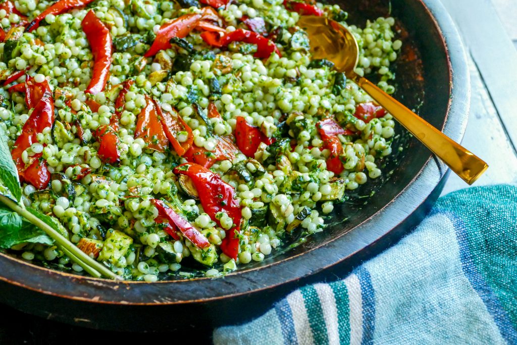 Salade de couscous israélien aux courgettes et poivrons rôtis, vinaigrette au persil