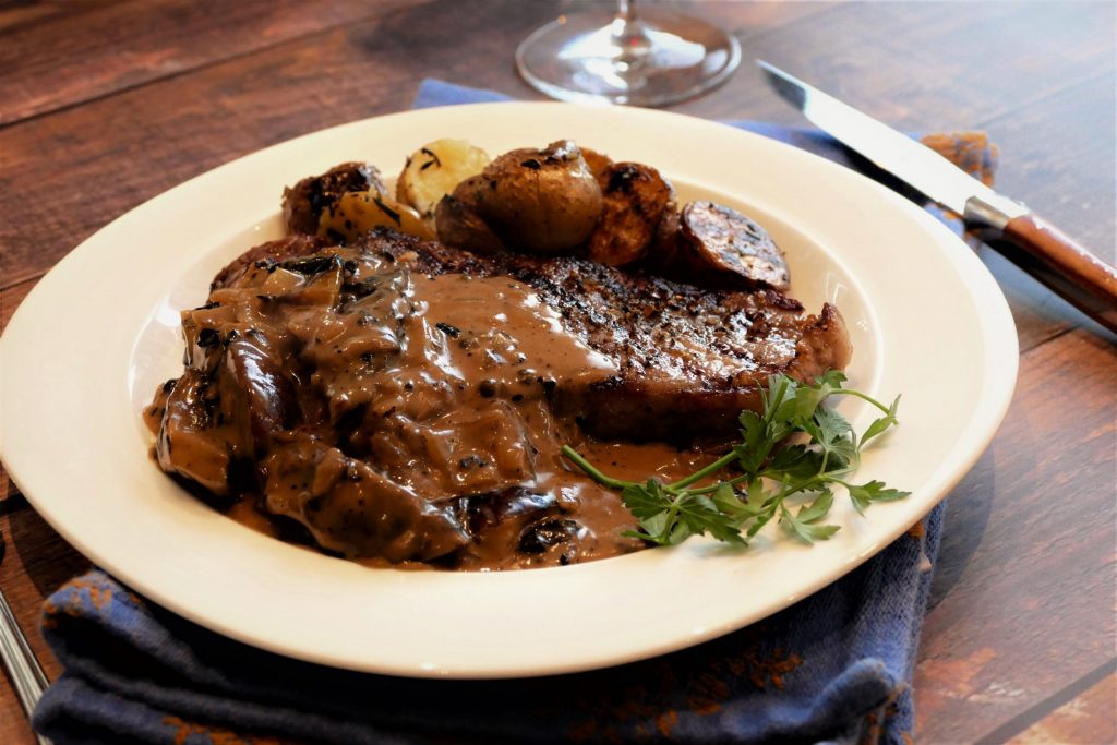 Contre-filets sauce aux poivres verts, aux champignons et oignons rôtis