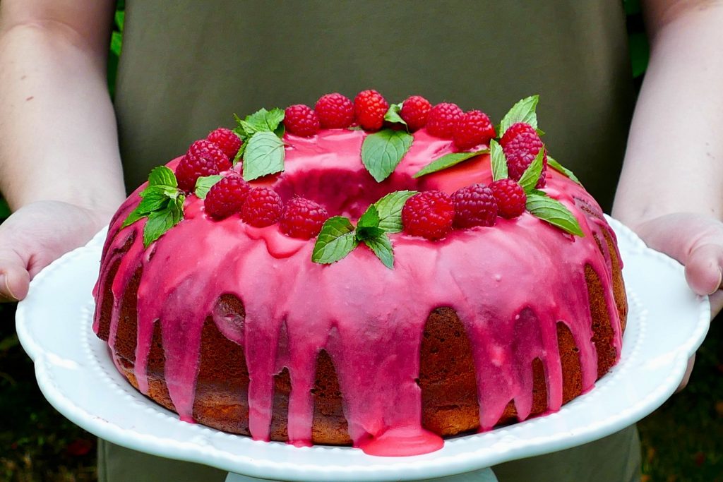 Gâteau Bundt aux pistaches, framboises et miel