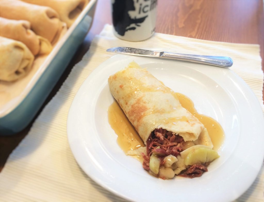 Effiloché de jambon aux pommes et sirop d’érable en crêpe
