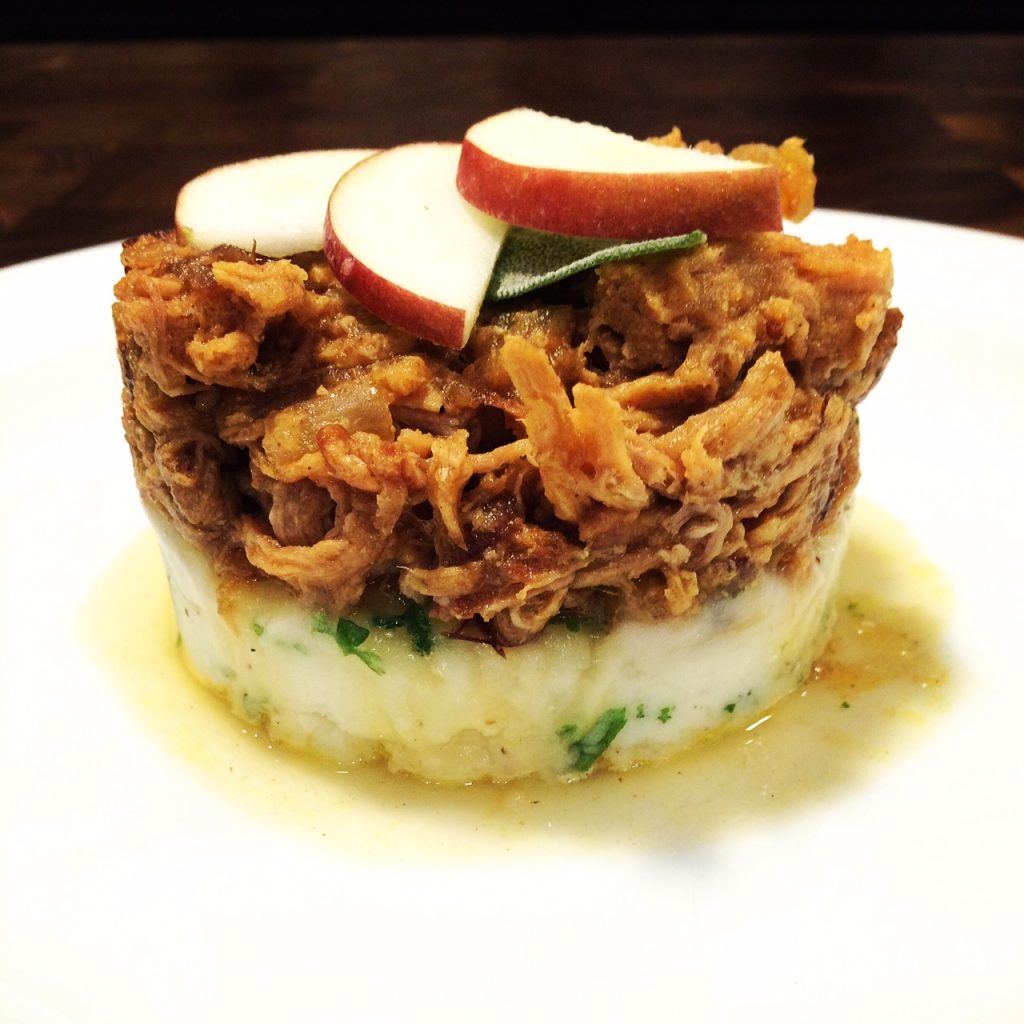 Porc effiloché aux pommes, cidre et canneberge