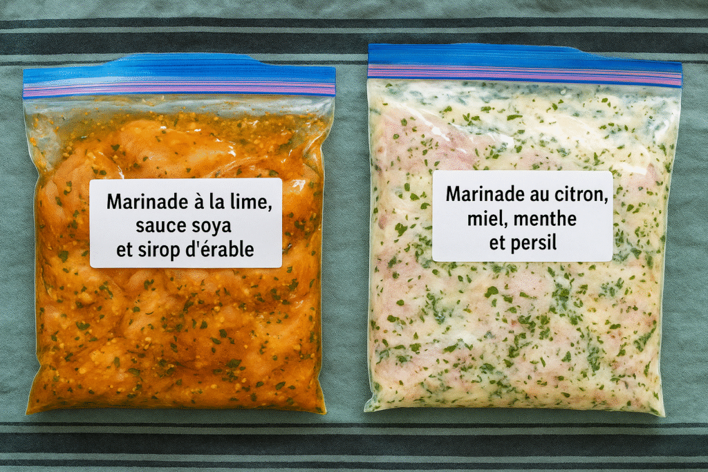 Deux marinades pour poulet : à la lime, sauce soya et sirop d’érable et au citron, yogourt, miel, menthe et persil