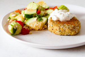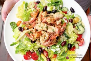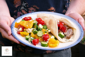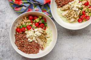 Bol de poulet, quinoa, salade à la grecque et tzatziki